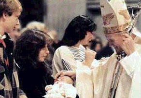 The Beast of the Apocalypse gleefully marks the forehead of an unsuspecting infant by signing the cross with his right hand.