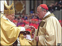 The Pope presents his newly created Cardinal with a gold wedding ring.