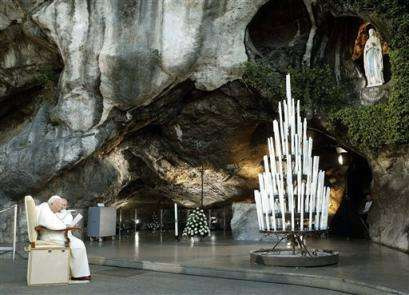 Celebrating the 150th anniversary of the Roman Catholic Church's discovery that the Virgin Mary was born without sin nearly 1,900 years after the fact, the sinful Holy Father, an acknowledged thief, came to sip from the curative underground spring waters of the Lourdes grotto. This infallible discovery and dogma of the Immaculate Conception gives Mary preeminence, once again,  over her sinless Son, Christ, born 15 years later.