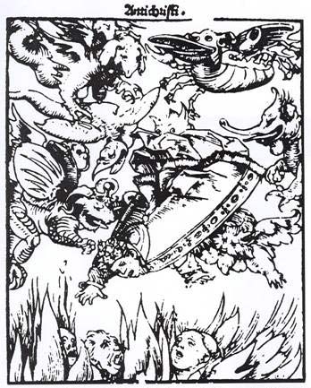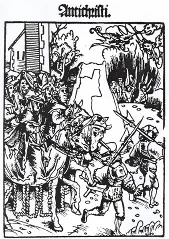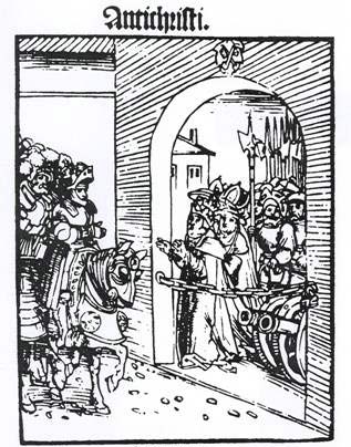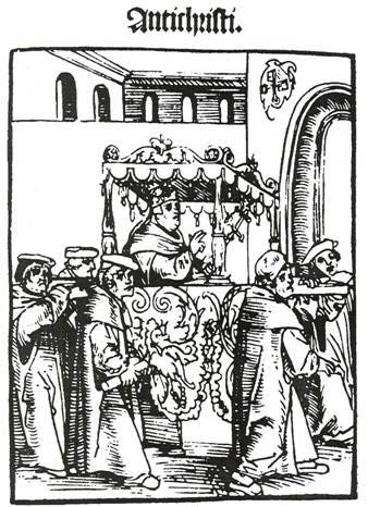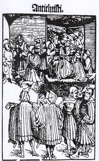 Further Contrasts in This Series Christ is crowned with thorns, while the Pope is crowned with the triple tiara, the sign of his secular power, said to be inherited from Constantine. Christ washes the feet of His disciples, while the Pope presents his foot for princes and kings to kiss. Christ commanded paying authorities their due, (Matt. 15), a command repeated in Romans 13. The Pope claims exemption for all his followers. He orders the Interdict on those who follow Christ’s command by levying tax on clerical persons or their property. Christ ministered to the poor and lame in humility, taking the form of a servant. The Pope considers it beneath his dignity to humble himself, believing that the humble man brings contempt upon his government. Such an argument is fit for fools, but the Pope must think the Germans fools, to try to rule over them as he does. Christ was born of humble parents, in a stable. The Pope is armed, ready to wage war. Such are the lengths to which he will go to ensure clerical possession of his property – he is willing to spill Christian blood, overturning civil authority. Authorities who imprison clergy will find that the Pope releases their subjects from their oaths of obedience, allowing the defense of clerical goods with both the secular and spiritual swords. Christ commanded His disciples go poor into the world. The Pope commands that no bishop should preside over no less than a great town, and he should be given sufficient provision, worthy title and great honor. Christ reminded the murmuring Pharisees that the kingdom of God was not in externals, but within us. In keeping the laws of men, such as papal disciplinary laws, one may transgress the laws of God. The Pope sits on a throne, issuing laws wholly concerned with externals the ordering of clothes, tonsures, feast days, consecrations, benefices, monkish sects and priests. Yet the clergy call themselves and their property Christ’s Church, and regard themselves as the elect of God, as if the laity were not in the Church. END TITLE INDEX >> HOME [1] FOR THE SAKE OF THE SIMPLE FOLK: Popular Propaganda for the German Reformation, R. W. Scribner, (Cambridge: Cambridge University Press, 1981), pp. 150-55. “A Passional was a small picture book depicting scenes from the life of Christ or the saints for pious meditation by the unlearned.” (p. 149) [2]