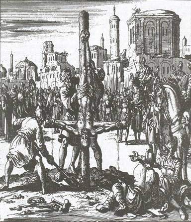 [1] “In this table and in all others, the new color signifies the Jurists, who are better called pseudo-prophets, and the old color signifies the humble imitators of Jesus Christ and his law.” This citation and text taken from Transactions of the American Philosophical Society, vol. 55, Part 1, 1965, article, Master Nicholas of Dresden, The Old Color and the New, (Phila.); Eds. Kaminsky, Bilderbeck, Boba & Rosenberg; pp. 38-65. [2] Howard Kaminsky, A History of the Hussite Revolution, (Berkeley: Univ. of CA Press, 1967), p. 48. [3] This ministry does not condone graven images, as Nicholas did not. Not having access to the original drawings used in the Tables, we substitute a Renaissance painting for its similitude. [4] This drawing is from an early 16th century German Protestant tract contrasting Christ with Antichrist. [5] E. g., pomp and worldliness. [6] John Andree, Gloss on the Preface to the Clementines. [7] Pictured making his Donation. [8] (XCVI. Dist., c. 14.) [9] Illustration taken from Martyrs’ Mirror. [10] Emperor Lewis the Pious is pictured giving the Donation centuries later. [11] (Decretals, LXIII. dist.,c. 30.) [12] Nicholas Lyra, Commentary on Daniel 8. [13] Pope Gregory, On the Antichrist, Moralia, XXXII. [14] From authoritative Roman Catholic Gloss on Rev. 13:7, 15, 17. [15] Haimo’s Commentary on Rev. 13:17. [16] From authoritative Roman Catholic Gloss on Rev. 13:2. [17] Lyra on 1 Peter 5:13; Micah 4:10. [18] From authoritative Roman Catholic Gloss on Daniel 12:10. [19] Lyra on Daniel 12:10. [20] Lyra on Ezek. 38:20; and Gloss; also Rev. 11:3. [21] Woodcut by 16th century German, Albrecht Durer. [22] Etching by Rembrandt. [23]