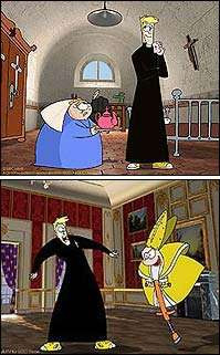 Figure 87 An animated cartoon series, Popetown , produced for the BBC, has been shelved due to outcries from the Roman Catholic Church and laity. Set in the Vatican, its principal characters included an infantile pope on a pogo stick, an ambitious nun, and back-stabbing Cardinals. Is it not curious how the Roman Church finds this offensive, yet turns a blind eye to the pedophilia and homosexuality of its priests? |